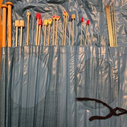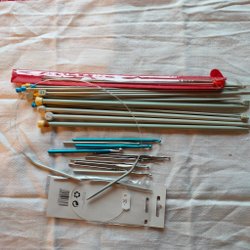En hel hög med olika stickor även rundsticka (tror jag dom heter) helt osorterade efter gumman