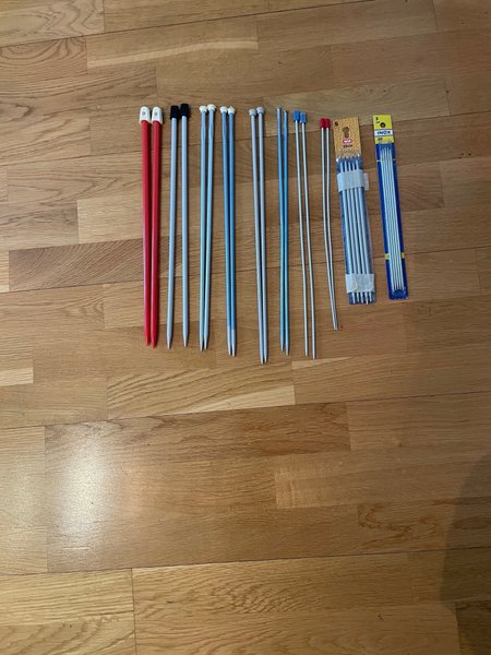 Stickor nr 9, 7, 6, 5 1/2, 5, 4, 3, 2 1/2 och strumpstickor nr 5 och 3.