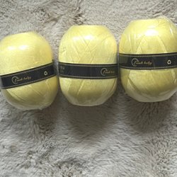 3 nystan a’ 150 gram ljust gult mycket tunt (1 mm) virk/ stick garn. Viskos 35% rayon 35% akryl 30%. Lopplängd ca 500 meter Garnet är silkeslent mjukt följsamt med lyster.