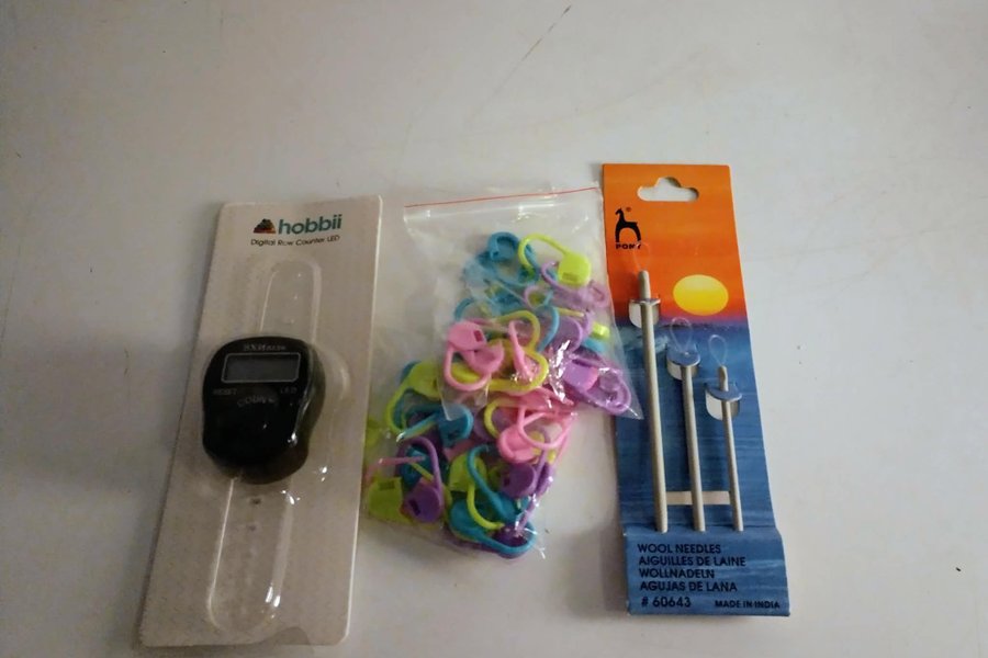 Ullnålar 3 st märke pony, varvräknare märke hobbii, stickmarkörer 40 st märke hobbii