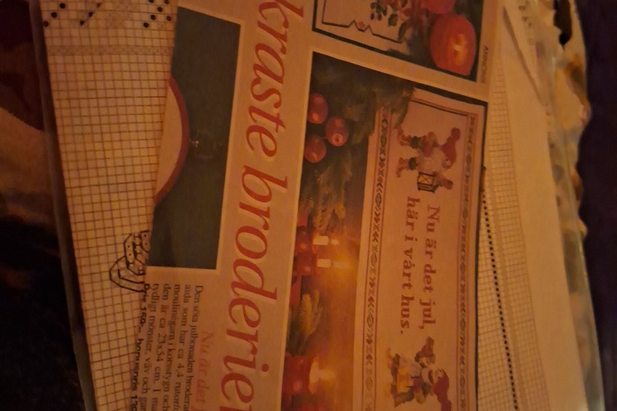 Mönster för julbroderi. Innehåller mönster och beskrivning för att brodera en julbonad på ca 23x54 cm. Endast mönster o restgarner