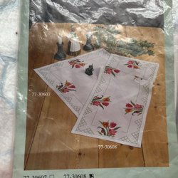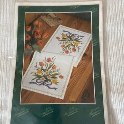 Korsstygnsmönster med blommigt motiv. Färgkarta med symboler och färgnycklar med färgkoder medföljer.