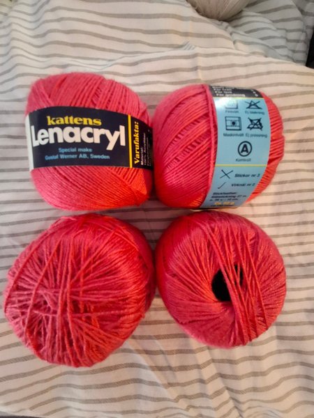 4 nystan kattens lenacryl virkgarn, cerise. Varje nystan 50g. Det ena är inte fullt