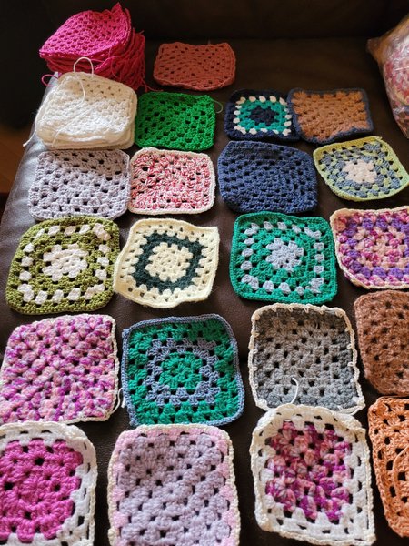 36 stycken mormorsrutor 9×9 cm. Varav 5 vita och 12 cerisa.Jag har ej fäst alla trådar.