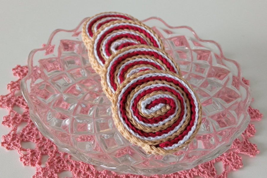 - Fyra stycken rulltårtsskivor med grädde och hallonsylt. Ca 6,5x6 cm. Virkade i kabeltvinnat bomullsgarn 12/6.