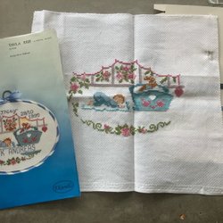 Komplett broderi till en tavla som minne av dop, namngivning e d eller bara som ett minne av födsel. Innehåller mönster, väv och garn. Innehåller ej ram. Mönsterarket är också kompletterat med alla bokstäver och siffror. Färdigt mått 24 x 24 cm.