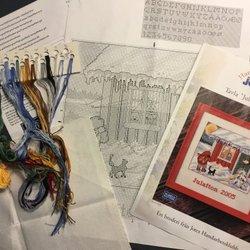Julmotiv på en tavla/vepa storlek 40×55 korsning komplett med garn och synål samt en förstorad arbetsbeskrivning.