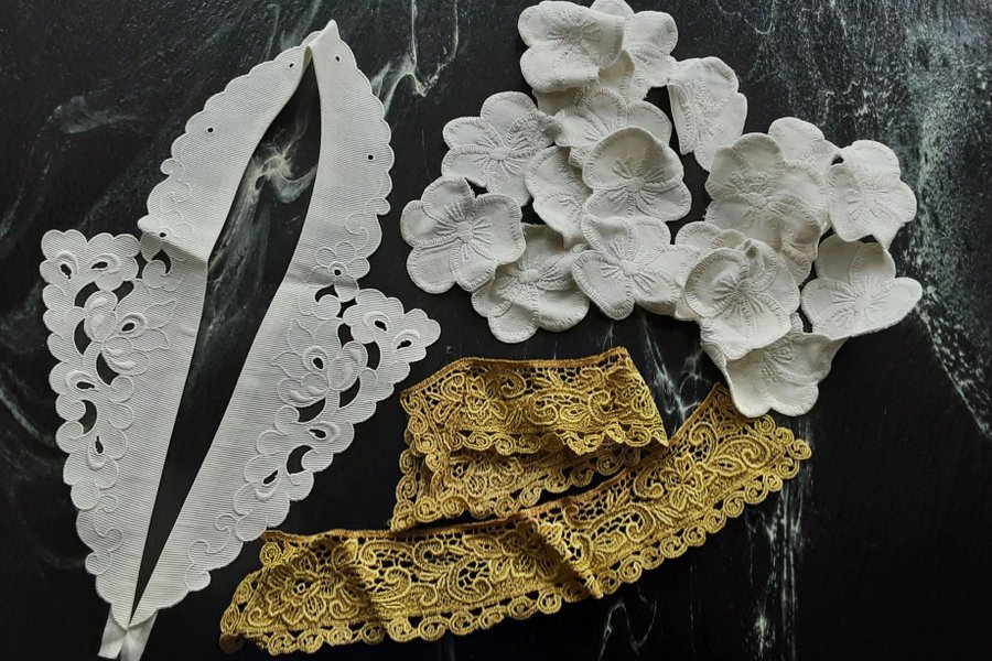 2 st äldre kragar + Längd broderade vita blommor