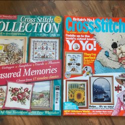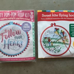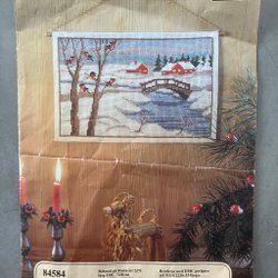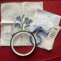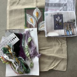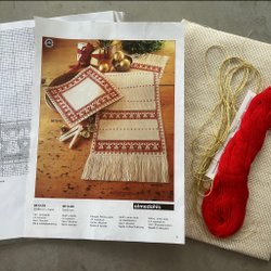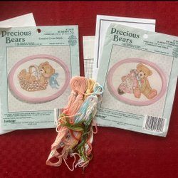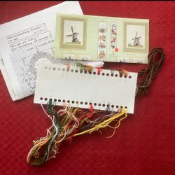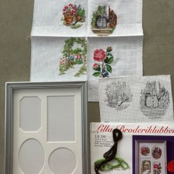 Komplett material till 2 söta flexitavlor; DMC moulinégarn, 2 bitar vit aidaväv 5,4 rutor/cm, 2 vita flexitavlor 6x9 cm samt mönster till alla tre.