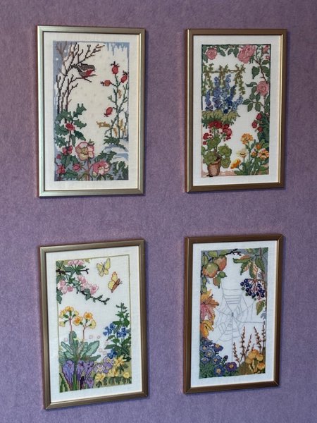 Dessa tavlor är broderade med korsstygn och föreställer olika årstider. Motiven inkluderar fåglar, blommor, fjärilar och spindelnät. 20x30 cm