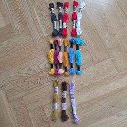 Fem st broderiväver i olika storlekar och färgnyanser.