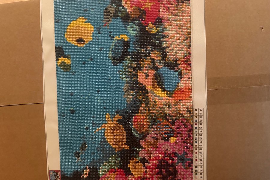 Färgglad diamanttavla med motiv av fiskar och koraller. Storlek: 30 x 40 cm.