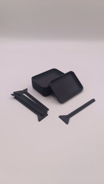 Mellanstora blandbrickor med omrörare för epoxy, färg m.m. storlek bricka: 35x50mm.