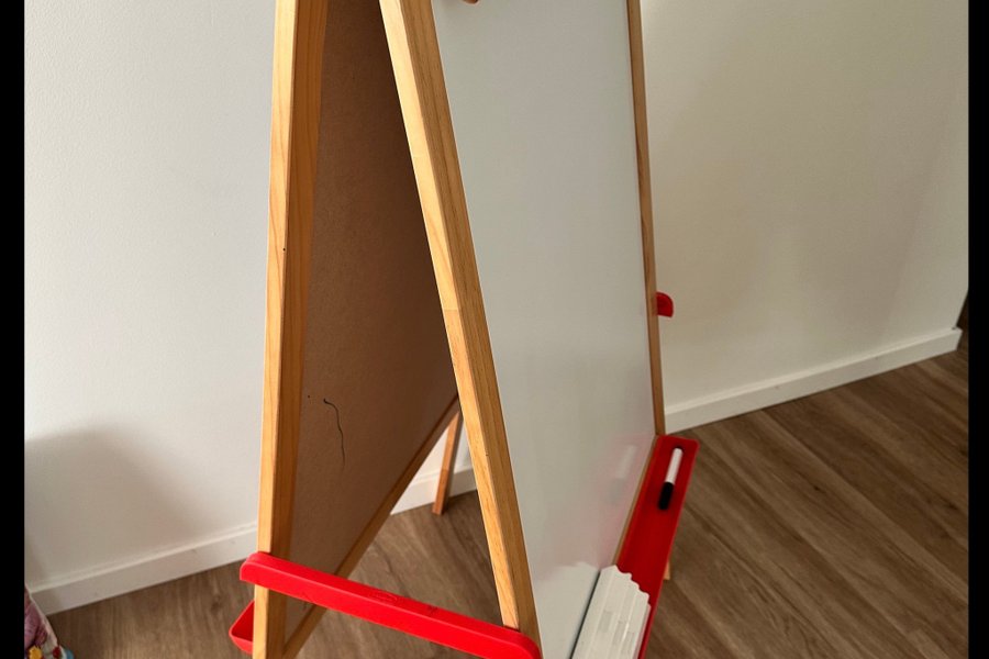 Målarstaffli i trä med en vit tavla på ena sidan och en pappersrulle på toppen. Staffliet har en röd hylla för kritor eller pennor.