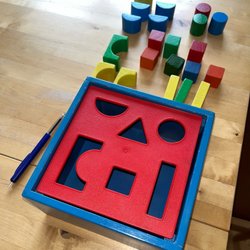 Klassisk formlåda i trä med olika former. Locket är avtagbart för enkel åtkomst till formerna.