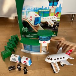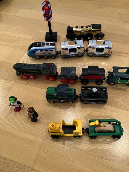 Ett BRIO tågset med lok, vagnar, figurer och en trafiksignal. Fem lok varav två är batteridrivna. (Batterier ingår ej).
