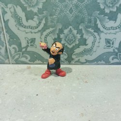 En ledbar träleksak i form av en hund. Leksaken har ett gult huvud och gula ben, en röd kropp samt svarta fötter och svans. Den är utrustad med rörliga leder och en flexibel svans. Tillverkad i Belgien.