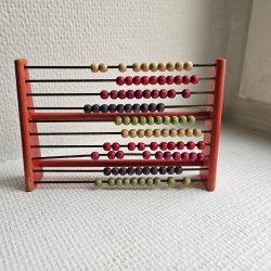 Kulram i trä med färgglada kulor. Denna kulram har 10 rader med 10 kulor vardera, i färgerna grön, blå, brun, röd och gul. Ett klassiskt verktyg för att lära sig räkna.