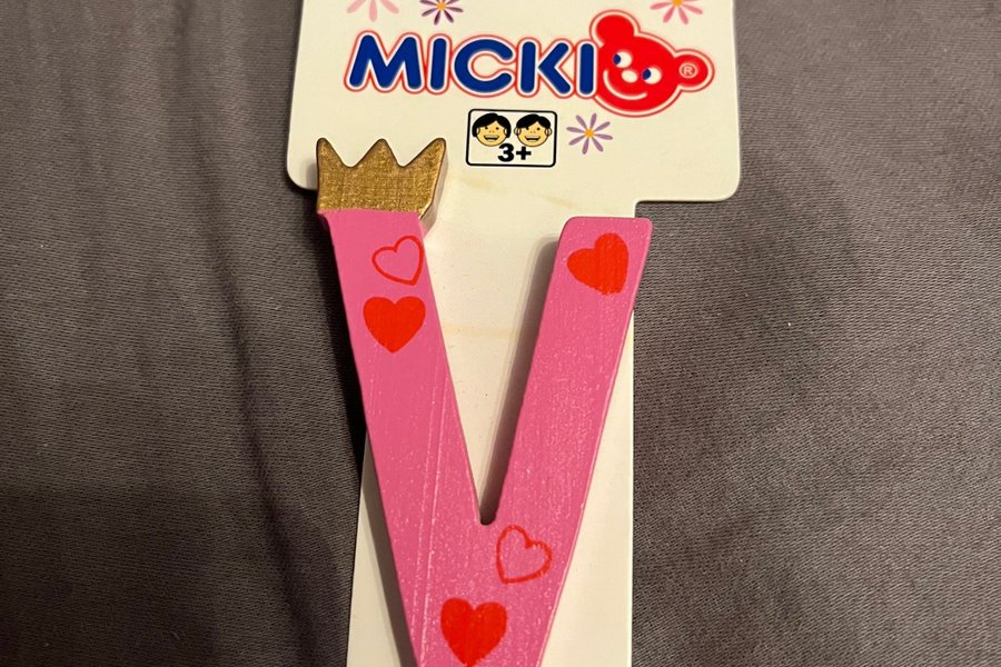 En rosa träbokstav "V" från Micki. Bokstaven är dekorerad med röda hjärtan och en guldkrona.