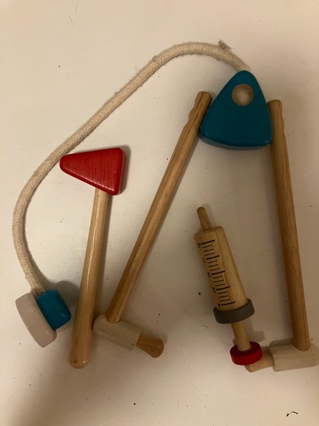 Läkarkit i trä med stetoskop, hammare och spruta. Leksakerna är i trä med detaljer i rött och turkost.