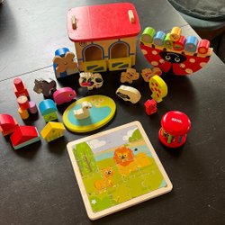 Träleksaker för barn. Setet innehåller två röda ringar, en skallra, klossar och kulor i olika färger. Leksakerna är sammankopplade med snören.
