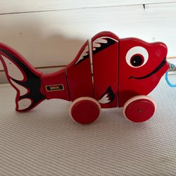 Klassisk BRIO dragleksak i trä. Tillverkad i Sverige. En snurra saknas. Vintage 60/70 talet
