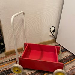 Gåvagn i trä med handtag och fyra hjul. Vagnen har en öppen låda för förvaring.
