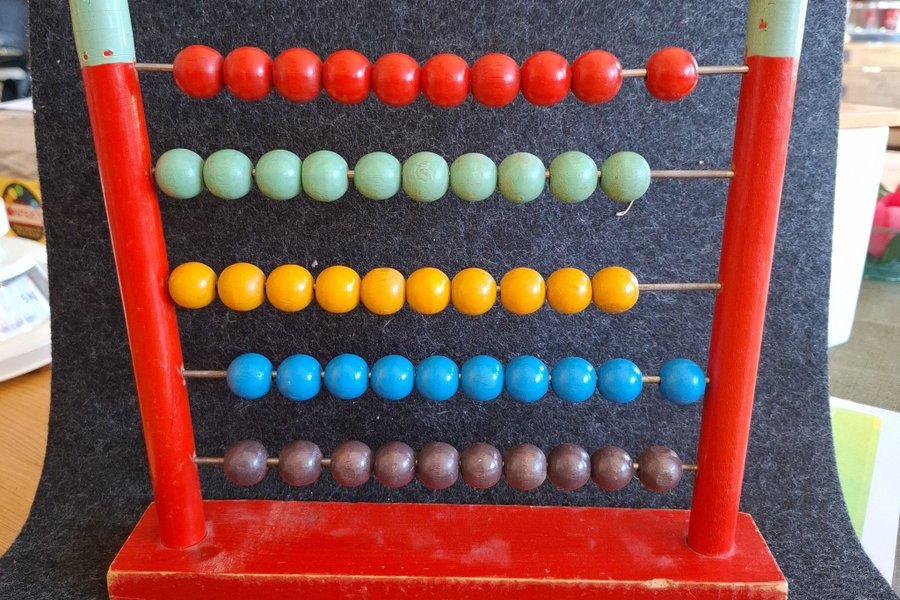 Kulram i trä med fem rader. Varje rad har tio kulor i olika färger: röd, grön, gul, blå och brun. Ramen är röd och topparna är ljusgröna.