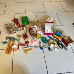 Ett blandat sortiment av leksaker. Inkluderar bland annat en Spybots robot, riddarhjälm, Squishmallows, leksaksverktyg, dinosaurier, minioner, en väska med hundmotiv och mycket mer. Perfekt för barn.