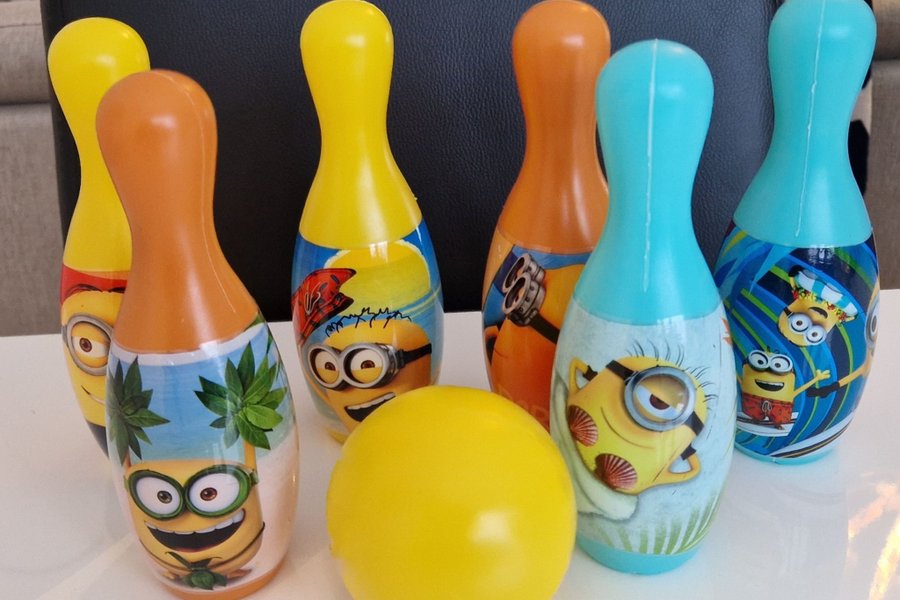 Ett roligt bowling set med Minions tema. Inkluderar sex käglor och en bowlingklot. Tillverkade av lätt plast. Passar småbarn. Fint skick. Snabb leverans!