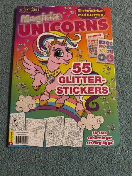 Magiska Unicorns tidning med 55 glitter stickers och 34 söta enhörningar att färglägga. ISBN: 7388163605908