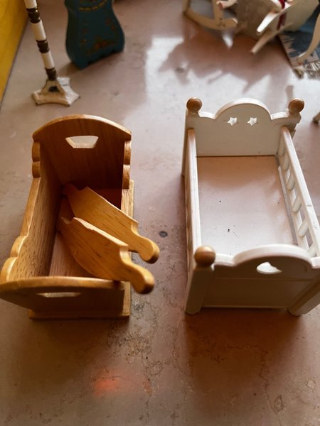 Två leksakssängar i trä. En vit och en träfärgad. Skenorna till vaggan ska bara limmas på. Till Lundby.