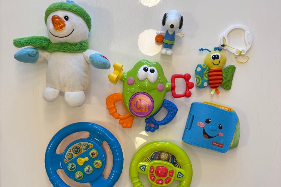 Ett paket med diverse leksaker. Inkluderar bland annat två rattar, en snögubbe, en skallra, en bok och en Snoopy figur.