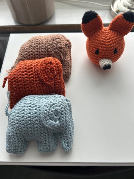 Virkade djur, mjuka att hålla i en liten barnhand. Virkade i bomullsgarn och elefanterna mäter cirka 10 cm i bredd. Kan även användas i sångpåse.