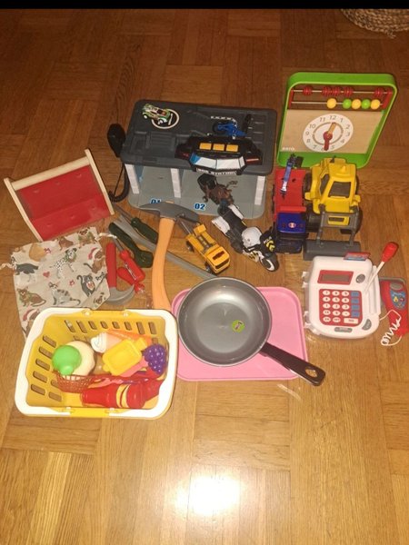 Ett blandat set med leksaker. Inkluderar bland annat en leksaksaffär med kassaapparat, verktyg, matvaror i en korg, fordon och en BRIO klocka.