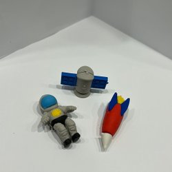 Set med radergummin med rymdtema. Inkluderar ett ufo och en farkost.