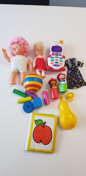 Ett blandat set med leksaker. Inkluderar två dockor, en Fisher Price telefon, en klänning, stapelleksaker, en boll, två hundar och en bok. Speldosa funkar men batteri dåliga nu. Speldosa är Norsk. Säljer endast inom Sverige då porto blir för dyrt