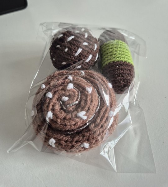 Detta är ett 3-pack virkade leksaker. Paketet innehåller en virkad chokladboll, en virkad dammsugare och en virkad kanelbulle. Perfekt present till barnkalaset ,eller istället för en blomma eller bara som dekoration Levereras i fin cellofan påse