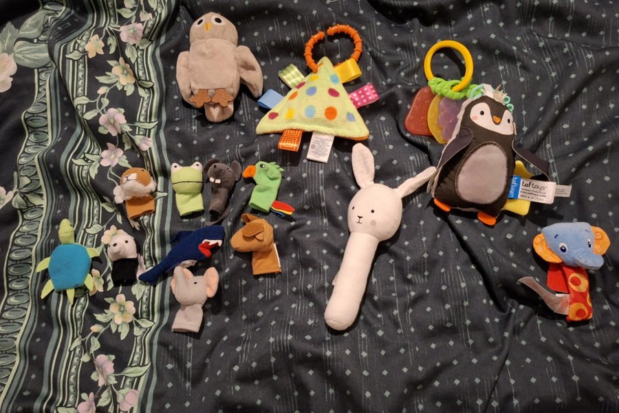 Mjuka bebisleksaker i fint skick. Några finger-puppets och lite annat blandat som låter och är mjukt. Allt i ett paket.