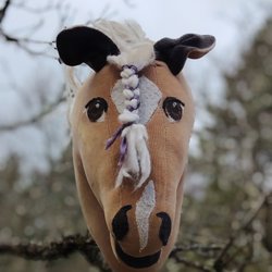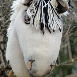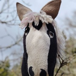 Hästen har en man i vitt garn och svarta ögon.