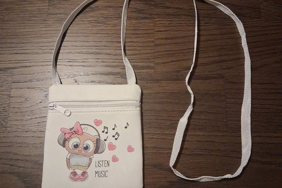 Söt liten väska med ett tryck av en uggla som lyssnar på musik. Väskan har en dragkedja och en lång axelrem.