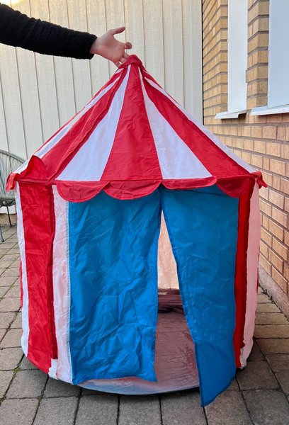 Lektält i form av ett cirkustält. Tältet har röda, vita och blåa färger. Det är enkelt att montera och demontera.