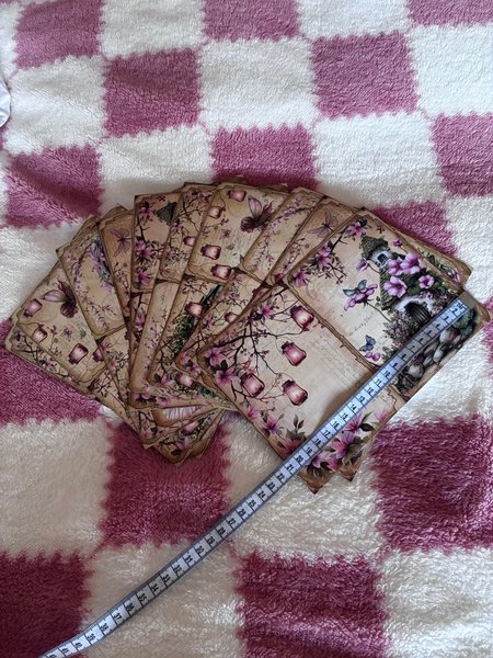 Dessa dekorativa pappersark har motiv av blommor, fjärilar och lyktor. Arken är 15 cm långa och 10 cm breda.