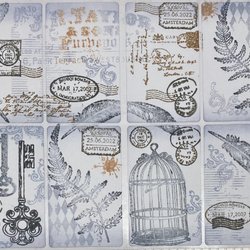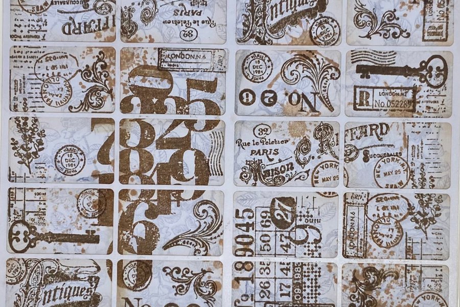 1 ark med 20 handstämplade etiketter till pyssel, junkjournal eller ev till annat skapande…