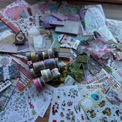 Diverse scrapbooking material. Inkluderar papper, washitejp och dekorationer.
