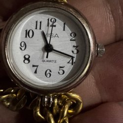 Citizen Quartz damklocka med guldfärgad boett och svart armband. Klockan har en quartz urverk. Baksidan är märkt med ”CITIZEN WATCH CO. BASE METAL YP 4031-894863 SMW 6021552 38-0661 +5”. Spännet är märkt med ”MONDIA”.fungerar som det ska nytt batteri mycket fint klocka