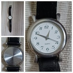 Snygg damklocka med vitt läderband och svart urtavla. Klockan är i gott skick och fungerar bra. Den har en quartz-rörelse.