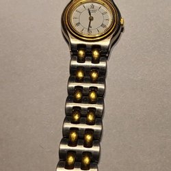 Info: Citizen damklocka med rektangulärt boett i guld och silverfärg. Klockan har en silverfärgad urtavla med guldfärgade detaljer. Urtavlan har arabiska siffror vid 12 och 6. Klockan är märkt med 'JAPAN MOV'T 5930-S100645 DF' på urtavlan och 'CITIZEN WATCH CO. BASE ST.STEEL 5939-H047669 TA WATER RESIST' på baksidan.