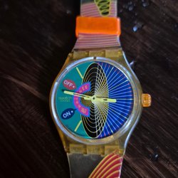 Klockan på bilden är en Swatch Gent Flex MATRIOSKA (L GK204). Den är inspirerad av rysk folklore och har matryoshka-dockor på urtavlan och armbandet.