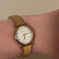 Elegant damklocka från O.N.E. Guldfärgad med strassdetaljer runt urtavlan. Levereras i tillhörande ask.